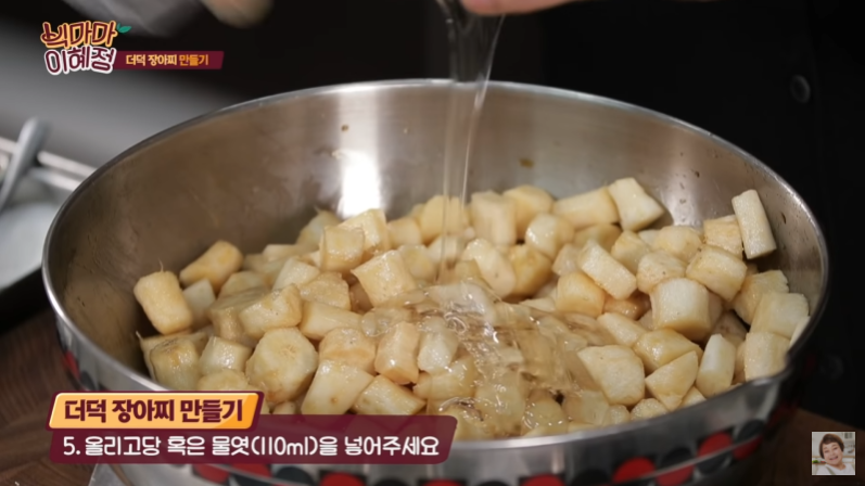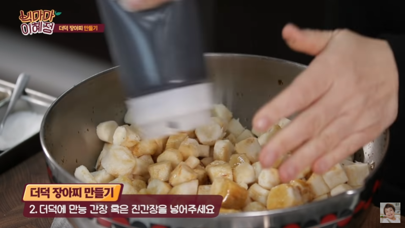 2. 더덕에 만능 간장 혹은 진간장을 넣어준다.