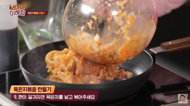 9. 팬이 달궈지면 묵은지를 넣고 볶아준다.