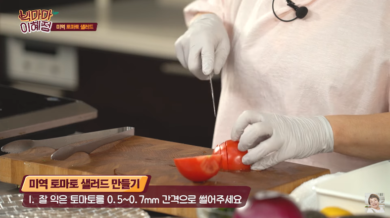 1. 잘 익은 토마토를 0.5~0.7mm 간격으로 썰어주세요.